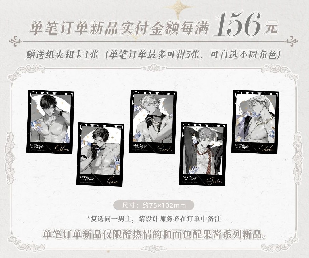 單筆訂單滿156r就可以獲得紙夾相卡一張,可選角色,最多可獲得5張